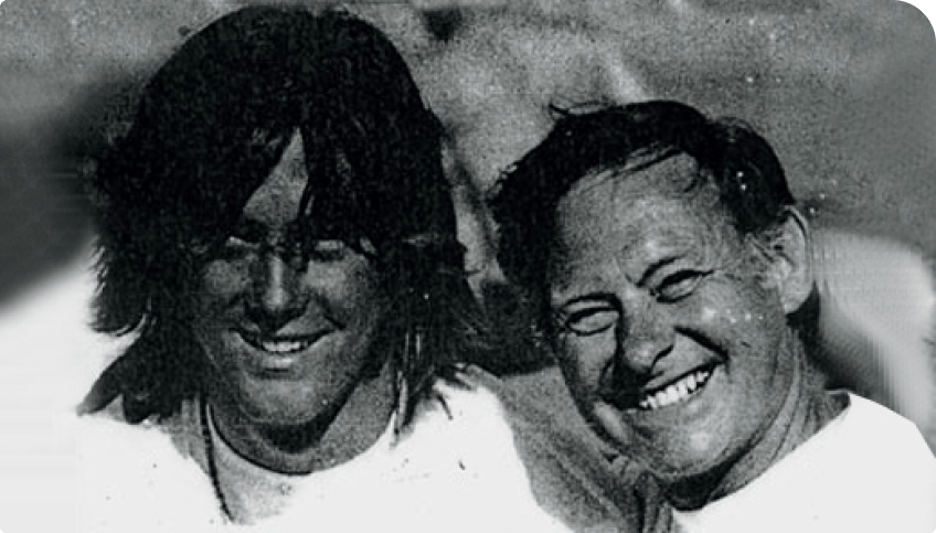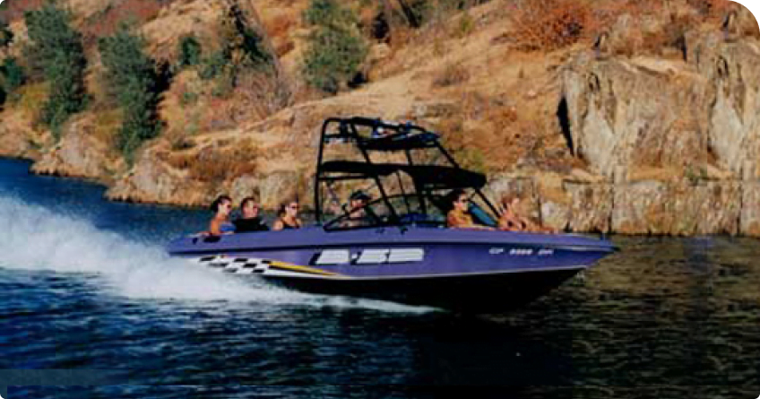 The first boat, built by Mike and Irv Brendel along with a few trusted partners. This boat was nicknamed “Kermit” because the gelcoat came out such a bright green. It was built at a friend’s farm near Merced, CA. Then Irv, Mike, and Delbert Briscoe (mike’s father-in-law) towed it across the country, for the waterski magazine test.